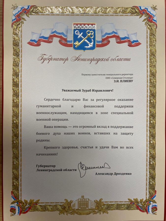 Губернатор Ленинградской области вручил Благодарственные письма нашим землякам