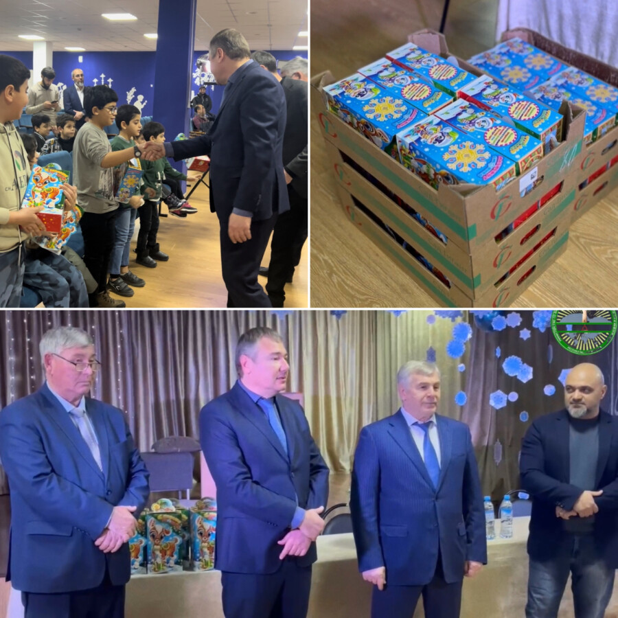 Председатель совета директоров ООО «Сад-гигант Ингушетия» Бекхан Хамчиев, руководитель Миннаца Ингушетии Руслан Мизиев и генеральный директор предприятия Ислам Алиев вручили новогодние подарки детям,