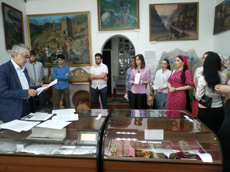 Первую экскурсию по музею для практикантов провел директор учреждения Магомед Сагов. Он ознакомил студентов с экспозициями и призвал их внести свой вклад в пополнение музейных фондов. Кроме того, Сагов попросил молодежь принять участие в создании экспозиции под названием «Генеалогическое древо тейпов ингушей», представив в музей свои тейповые генеалогические древа.