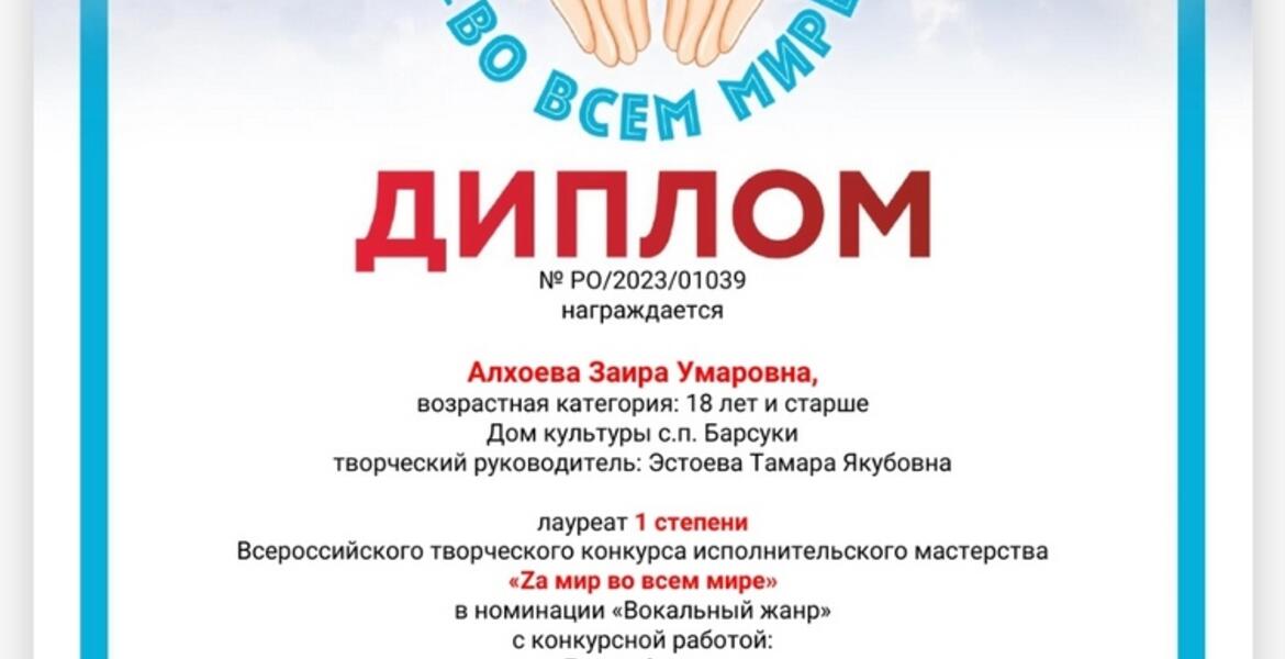 Руководитель вокального кружка Дома культуры сельского поселения Барсуки Заира Алхоева стала лауреатом первой степени Всероссийского творческого конкурса исполнительского мастерства «Zа мир во всем мире».