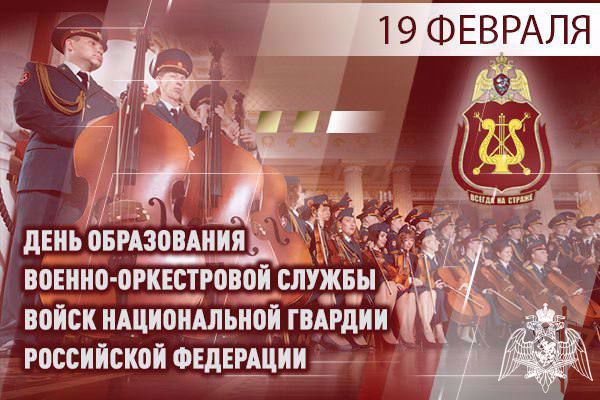 19 февраля в войсках национальной гвардии Российской Федерации отмечается день создания военно-оркестровой службы ведомства. Военная музыка во все времена служила средством военного управления, строевого обучения и воинского воспитания, а военные оркестры являлись эффективным инструментом поднятия боевого духа личного состава и формирования патриотических настроений, одним из символов Российской армии и культуры, хранителями традиций русского воинства и государства. В войсках правопорядка военные оркестры впервые упоминаются в 1921 году, когда было утверждено Положение о военных оркестрах войск ВЧК.