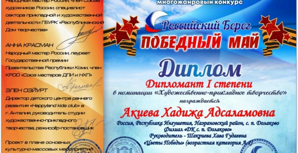 Победу и звание лауреата первой степени принесло воспитаннице кружка ИЗО Долаковского Дома культуры Хадиже Акиевой участие в IV Международном многожанровом конкурсе «Российский берег. Победный май». Выступая в номинации «Художественно-прикладное творчество», она представила на суд конкурсного жюри свои работы, объединенные общим выразительным названием «Цветы Победы».