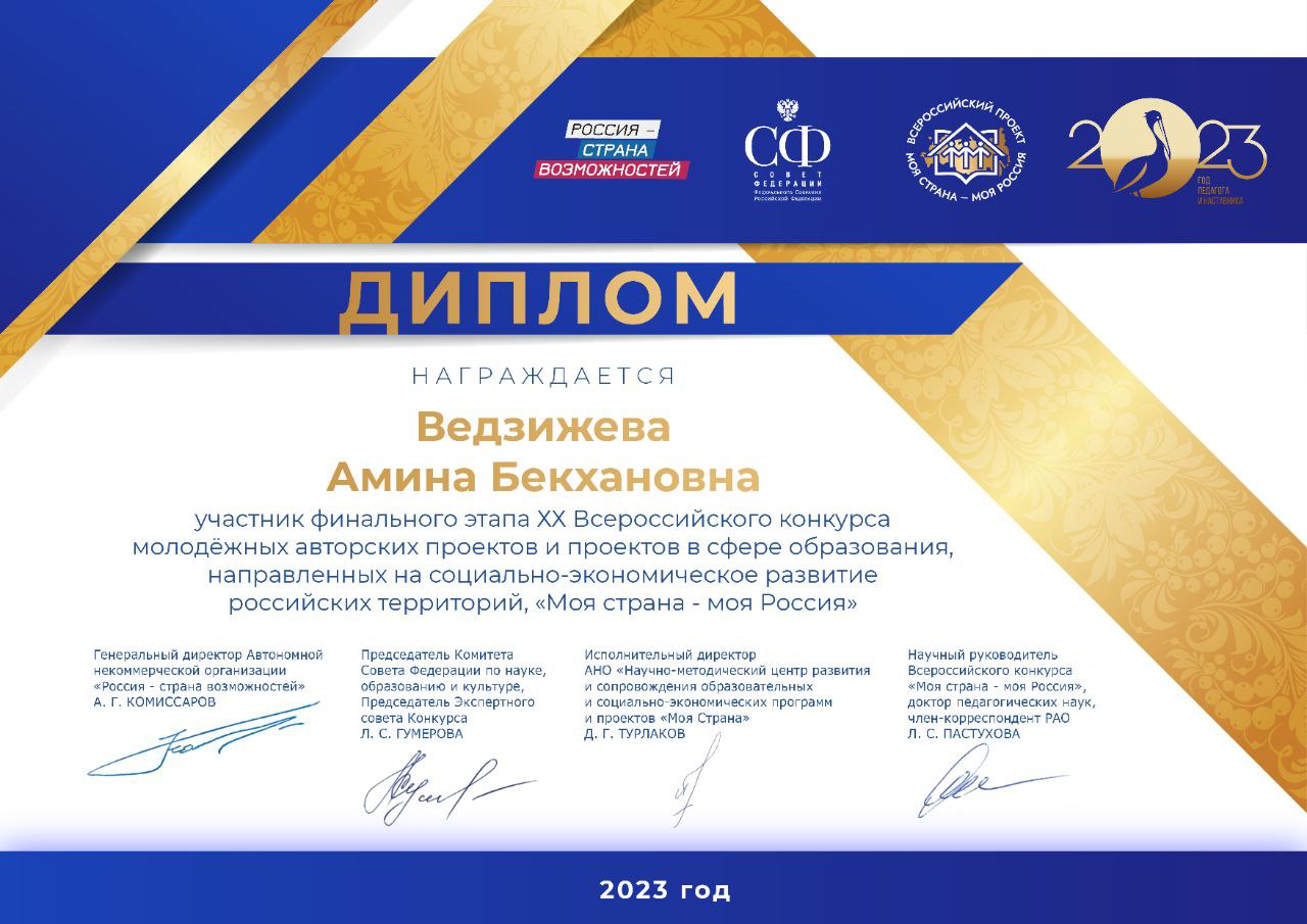 Активистка регионального движения детей и молодежи «Движения Первых» , ученица 11 класса школы № 2 с. п. Плиево Амина Ведзижева стала финалисткой Всероссийского конкурса молодежных авторских проектов и проектов в сфере образования «Моя страна – моя Россия».