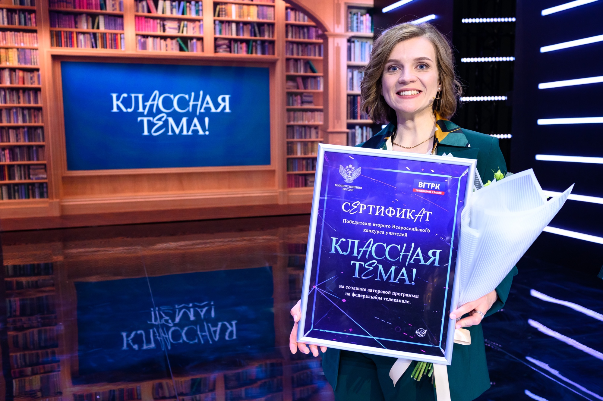 В эфире телеканала «Россия-1» состоялся финал второго сезона федерального проекта «Классная тема!», организованного по поручению Президента России Владимира Путина Министерством просвещения Российской Федерации и телеканалом «Россия-1» при информационной поддержке VK. Победителем педагогического состязания и обладателем главного приза – собственного авторского шоу на одном из федеральных каналов – стала учитель химии из Липецка Екатерина Сигарева.