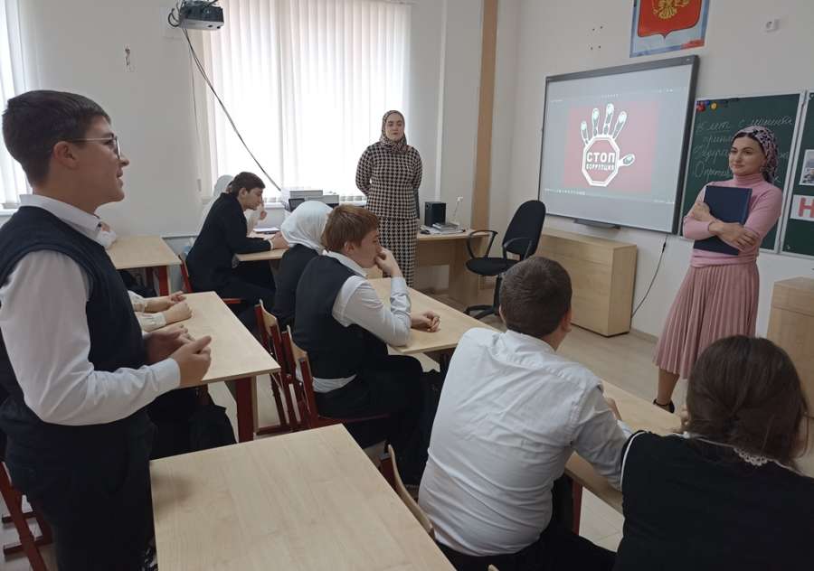В карабулакской средней общеобразовательной школе №5 с учащимися 10-11 класса провели открытый урок по теме «Нет коррупции!». Мероприятие приурочили к 15-летию принятия Федерального закона «О противодействии коррупции». Цель акции: формирование у подрастающего поколения негативного отношения к коррупции как к нежелательному социальному явлению, через понимание причин возникновения этого явления и вреда, причиняемого им обществу.