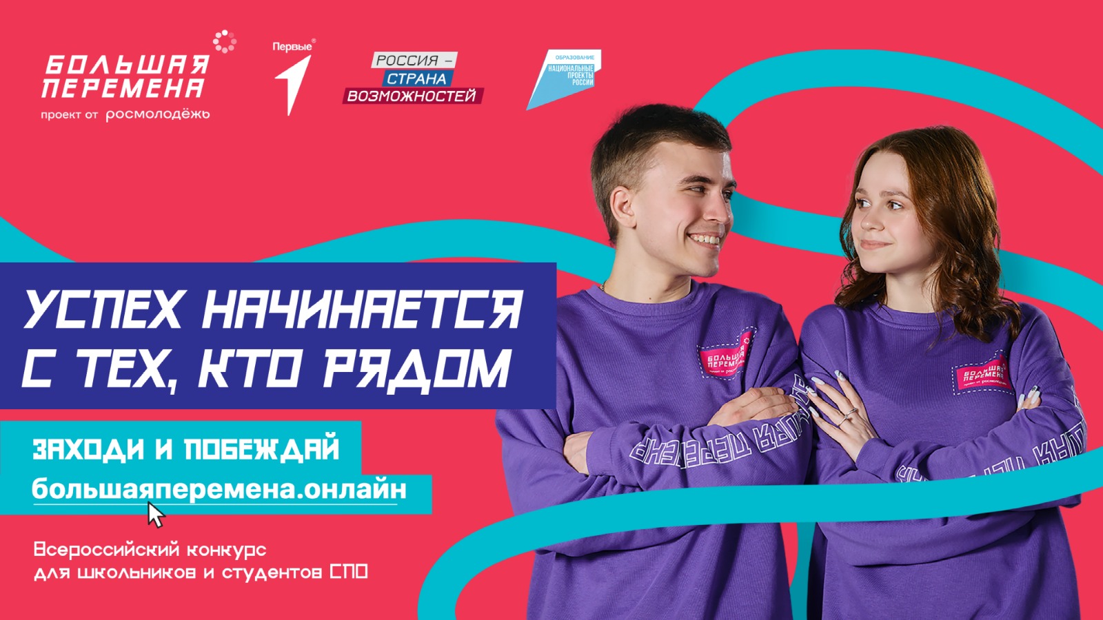 Конкурс является флагманским проектом Российского движения детей и молодёжи «Движение Первых». Соорганизатором проекта выступает Федеральное агентство по делам молодежи (Росмолодежь). Конкурс входит в линейку президентской платформы «Россия – страна возможностей». «Большая перемена» проводится при поддержке Министерства просвещения РФ и Министерства науки и высшего образования РФ.