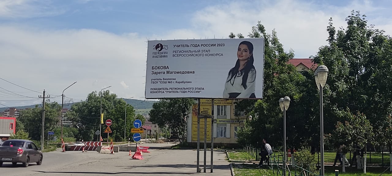 В рамках Года педагога и наставника в Карабулаке установлены баннеры с изображением победителя регионального этапа конкурса «Учитель года России» — 2023 Зареты Боковой.