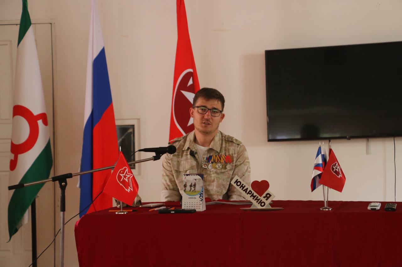Сегодня в лагере «Молодой патриот» города Малгобек в рамках проекта «Народного фронта. Всё для Победы!» дети встретились с участником специальной военной операции Магомедом Муружевым.