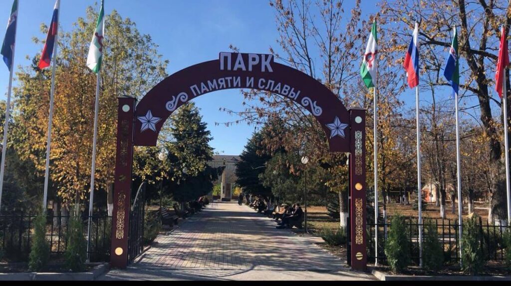 Парадный вход в парк СлавыЗа четыре года колледж успел принять участие во многих всероссийских и региональных мероприятиях, где занимал призовые места. Так, например, в 2021 году его студенты заняли первое место в республиканском форуме молодых строителей «СтройМолодежь-2021», в молодежном конкурсе граффити в 2020 г.в г.Сунжа. 28 студентов колледжа в 2022 году приняли участие в строительстве Северо-Кавказского молодежного образовательного центра «Машук», были отмечены благодарностью губернатора Ставропольского края. его студенты сильны не только в творчестве, но и в спорте. – В 2022 году команда колледжа заняла первое место в товарищеском матче по футболу в г.Карабулак среди студентов колледжей. 30 сентября 2022 г. заняли первое место в турнире по воркауту «Битва дворов» среди СПО РИ. Этот список можно продолжить еще многими достижениями студентов, а также преподавателей и наставников.