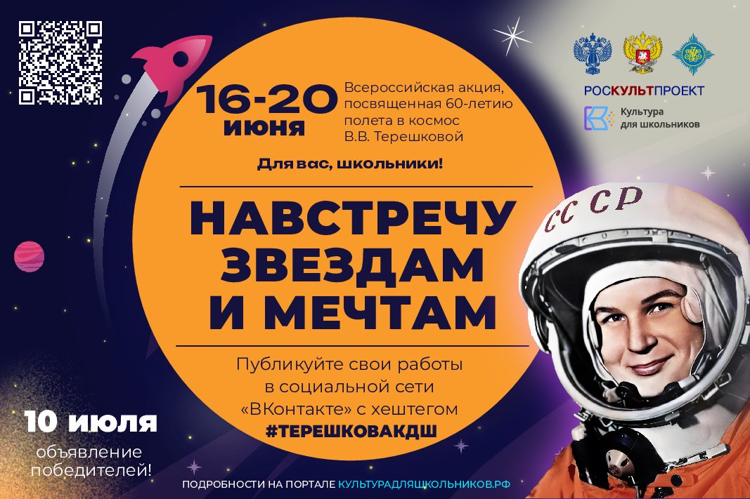 16 июня 2023 года в рамках проекта «Культура для школьников» стартует масштабная Всероссийская акция «Навстречу звездам и мечтам», посвященная 60-летию полета первой в мире женщины — космонавта Валентины Терешковой.