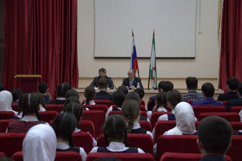 Заместитель главы Карабулака Азраил Джандигов и депутат городского совета, член общественного совета при МВД по РИ Хусейн Амаков обсудили с учащимися старших классов городской школы № 4 вопросы рейтингового голосования по отбору общественных территорий для их благоустройства в рамках национального проекта «Жильё и городская среда».