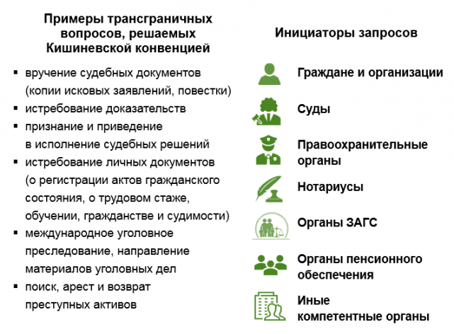 Конвенция о правовой помощи и правовых отношениях по гражданским, семейным и уголовным делам от 7 октября 2002 г., также известная как Кишиневская конвенция, востребована для судебных, правоохранительных и иных государственных органов, а также для граждан и организаций, участвующих в трансграничных отношениях.