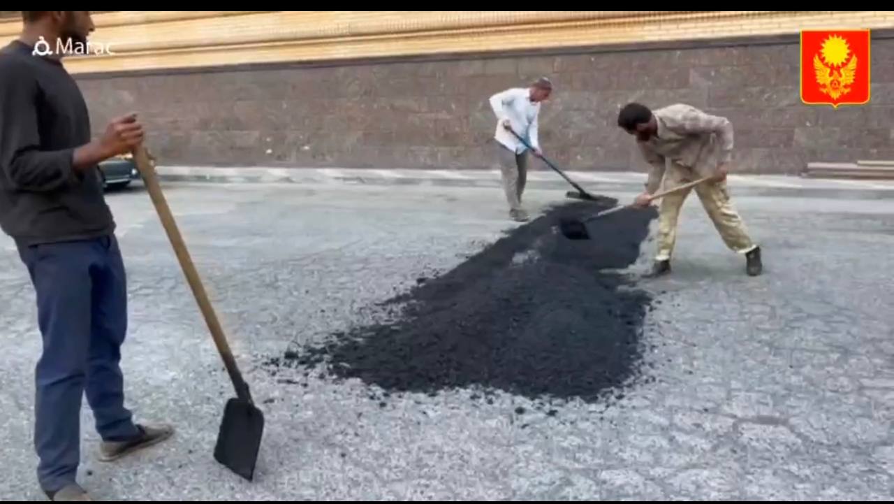 Бригады рабочих продолжают осуществлять ямочный ремонт на дорогах Магаса и установку искусственных неровностей в преддверии начала учебного года