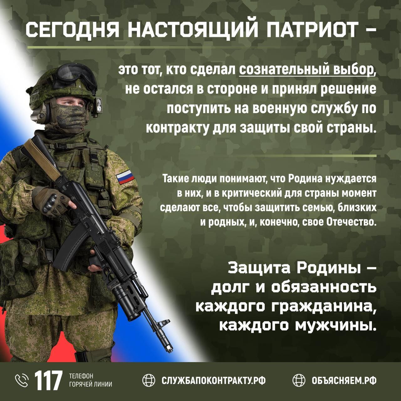 Сегодня настоящий патриот – это тот, кто сделал сознательный выбор, не остался в стороне и принял решение поступить на военную службу по контракту для защиты своей страны. Такие люди понимают, что Родина нуждается в них, и в критический для страны момент они готовы сделать все, чтобы защитить семью, близких и родных, и, конечно, свое Отечество.