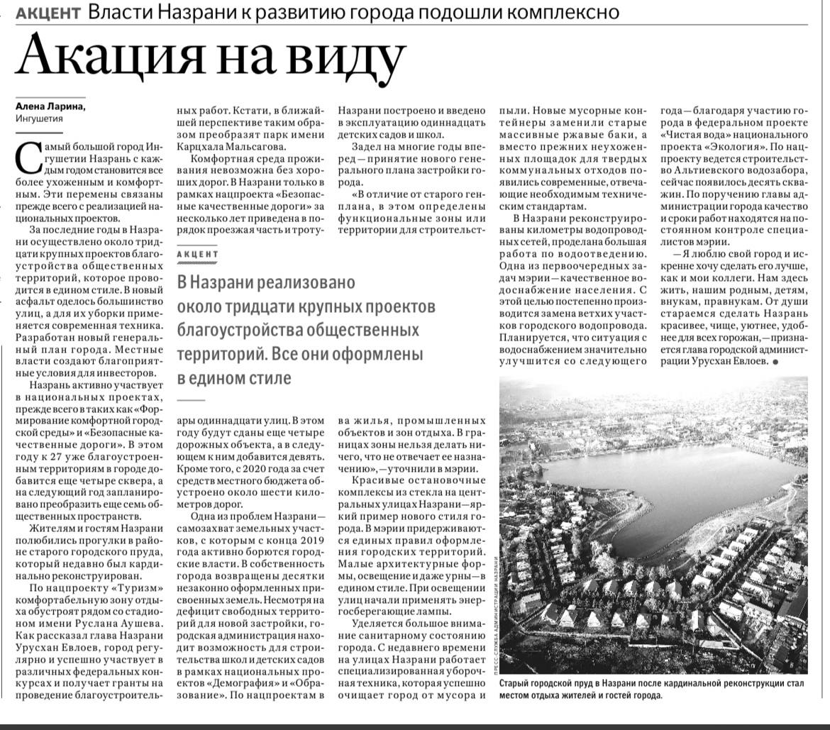 Издание Правительства Российской Федерации «Российская газета» опубликовало большую статью, посвященную городу Назрани, отметив успешную реализацию муниципалитетом национальных проектов и работу по изъятию незаконно оформленных земель.