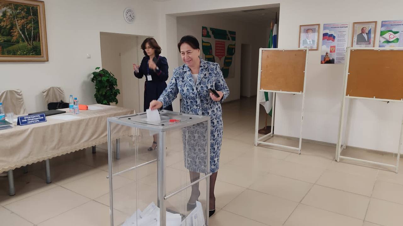 Министр здравоохранения Ингушетии Антошкиева Зарема проголосовала в УИК N 603 в Гамурзиевской школе N 7