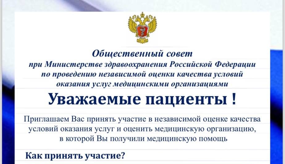 Приглашаем Вас принять участие в независимой оценке качества условий оказания услуг и оценить медицинскую организацию, в которой Вы получили медицинскую помощь.