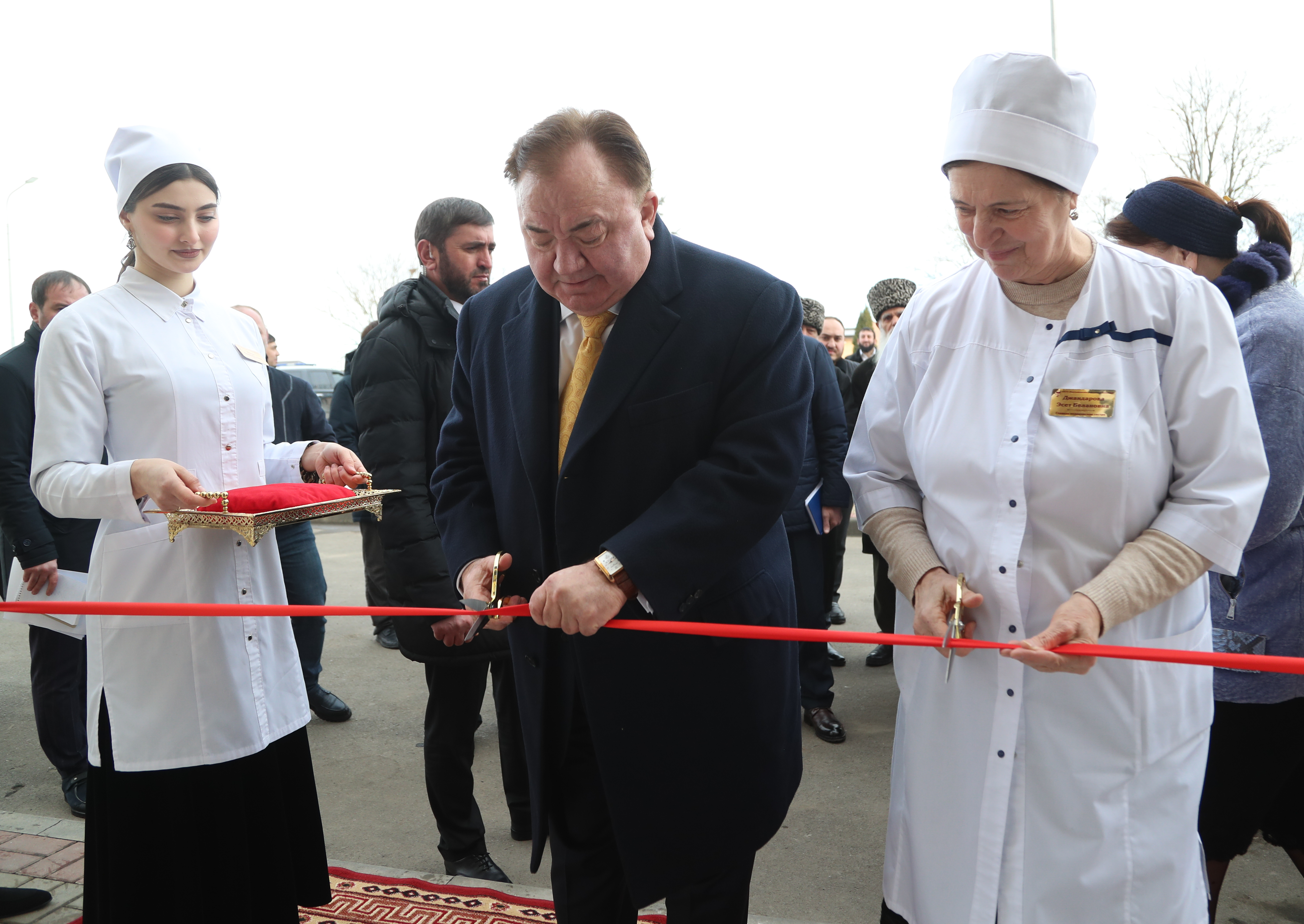 Ключевым моментом торжественного открытия медучреждения стало перерезание красной ленты. В традиционной церемонии приняли участие Махмуд-Али Калиматов и ветеран медицинской службы Эсет Джандарова.
