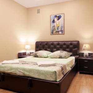 Мягкий ортопедический матрас на широкой двуспальной кровати, качественное постельное белье, посуда и кухонные принадлежности.