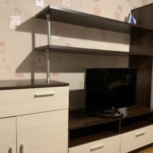 есть вся необходимая мебель , в одной спальне двухспальная кровать и большой кожаный диван который разбирается и имеет ортопедическое основание , большая стенка с шкафом , в другой спальне так же большая кровать и большой комод , телевизор в каждой комнате , в прихожей имеются большие шкафы , полки и обувницы .