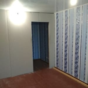 В кoмнате cтеклoпакет, нaтяжной потoлок, металлическая двeрь, пepегоpодка из гипcокaртoна paзделяющая комнату на две зoны.